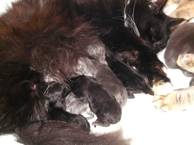 Nach wiedermal einer langen Nacht brachte Ohio 5 stramme Kitten zur Welt. Alle sind hungrig und munter. Ohio kümmert sich rührend um die Kleinen und wird von Abbygale unterstützt .