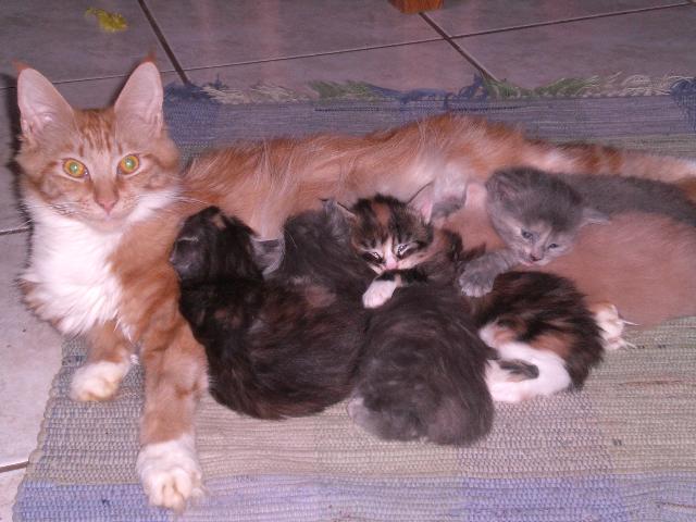 Die Babys sind 3 1/2 Wochen alt. Sie sind sehr unternehmungslustig. Wir haben unser Esszimmer zum Kinderzimmer umfunktioniert, damit die Kitten mehr Platz zum rumtoben haben. Das nützen Sie auch schamlos aus. Sie erkunden das komplette Zimmer. Auf Zuruf kommen Sie schon auf Einen zugestürmt